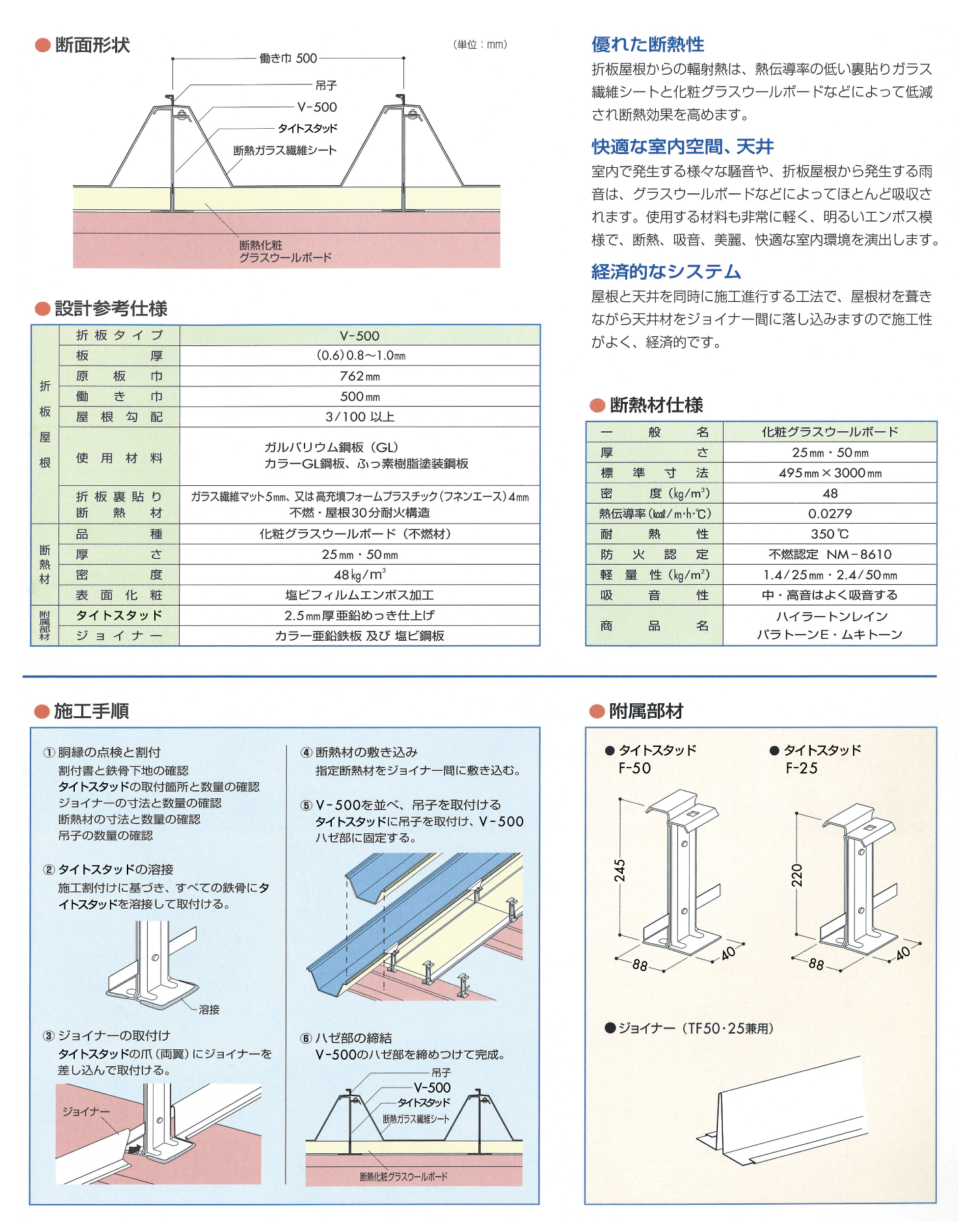 折板屋根からの輻射熱は、熱伝導率の低い裏貼りガラス繊維シートと化粧グラスウールボードなどによって低減され断熱効果を高めます