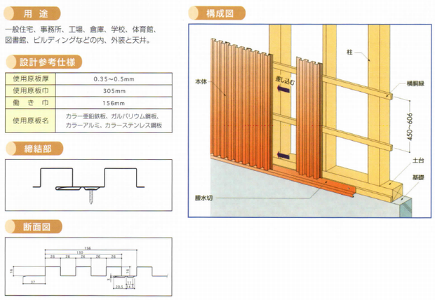 小幅ストライプラインが、あらゆる建物に映えます。また、内・外装、天井などの幅広い用途に使用できます